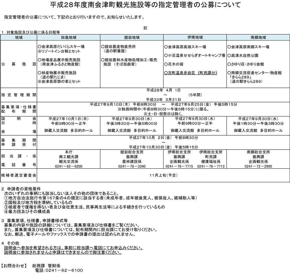 平成28年度南会津町観光施設等の指定管理者の公募について