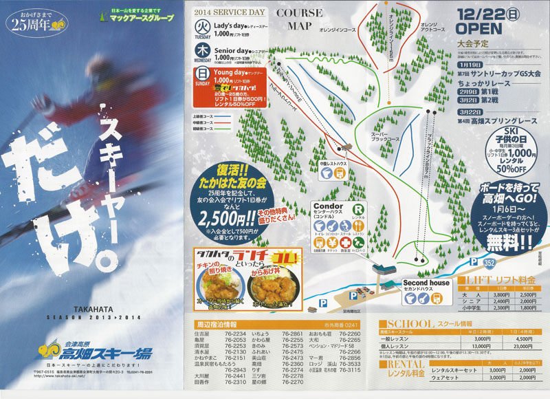 11月9日,10日で毎シーズンお世話になっている南会津の民宿「ロッジ溪山」にお邪魔した際に、高畑スキー場の今シーズンのパンフレットが届けられていたので一部いただいてきた。facebookのスキー場ページでもパンフレット完成と書いてあって、一部は欲しかったので丁度よかった。