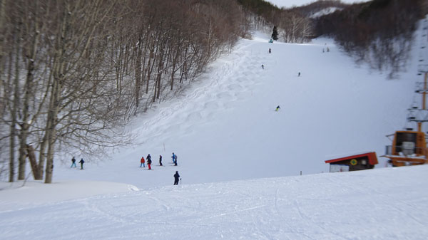 圧雪されたとこに作ったコブは朝の冷えこみにより固め。こちらは滑り易いが、油断してるとラインから発射してしまいそうになるくらいスキーが走る。