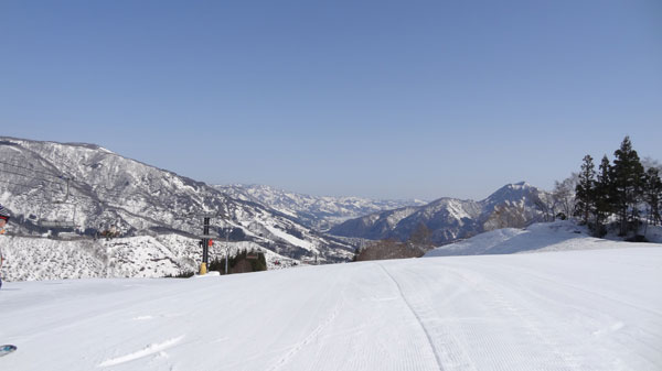 戸沢ペアリフト、池の平高速4人乗りリフトを乗り継いで山頂手前に到着。(この時期白板山ペアリフトが運行していないため山頂にはいけない)リフトから見ると圧雪が綺麗にしてある感じ。
