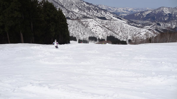 朝の時点では頂上付近のバーンは硬かったが気温が高くなり早々に緩んできた。
