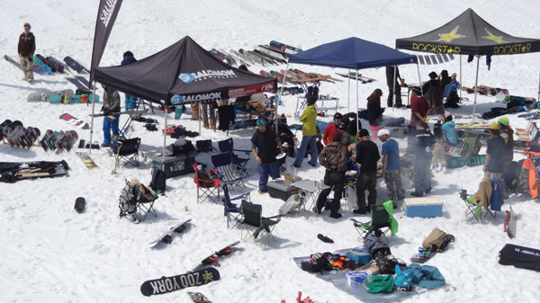 ゲレンデハウス脇では、スノーボードの試乗会が開催されていて、今日は天候に恵まれたためか試乗会のスタッフが楽しそうにBBQしていた。